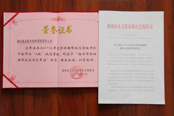 ? ? 近日,揚州海昌榮獲“2013年度勞動保障誠信示范單位”榮譽稱號,這是揚州海昌自2012年試運行以來首次獲此榮譽。