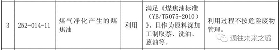 ? ? 以煤氣凈化產(chǎn)生的煤焦油為例,如果滿足《煤焦油標(biāo)準(zhǔn)(YB/T5075-2010)》,且作為原料深加工制取萘、洗油、蒽油等,利用過(guò)程就不按危險(xiǎn)廢物管理。