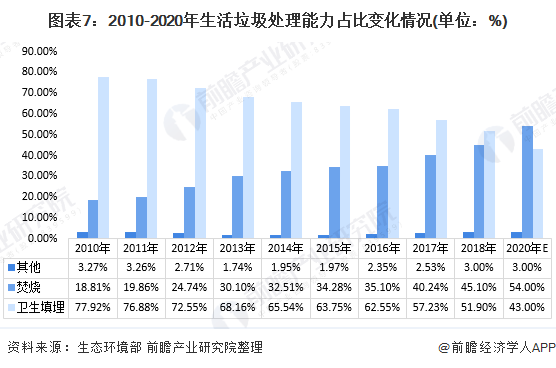 以生活垃圾為例。對生活垃圾的具體處理式有許多種,其中最常見的分別是衛(wèi)生填埋、焚燒和其他方式。目前,我國以衛(wèi)生填埋的應(yīng)用最廣,所占收運量的比例也最高;焚燒則通常限定在沿海地區(qū)。根據(jù)“十三五”規(guī)劃,到2020年,我國生活垃圾處理方式中,焚燒處理將成為大頭,占比將達(dá)54%。