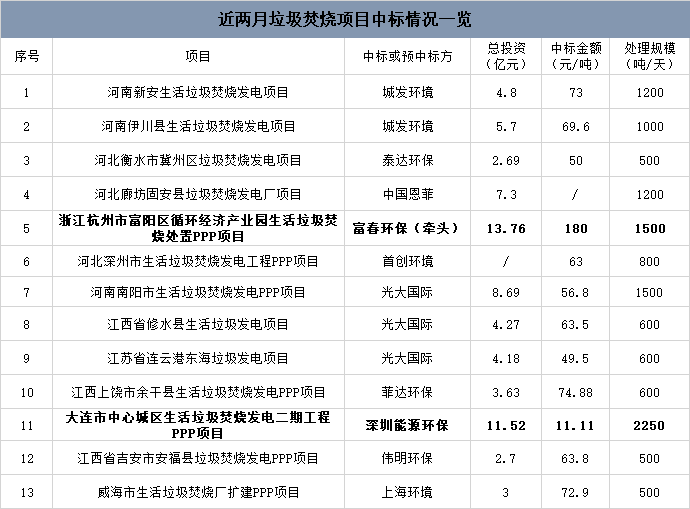 ? ? 第四,這兩月,出現(xiàn)了兩起比較特別的垃圾焚燒項(xiàng)目,一起是浙江杭州市富陽(yáng)區(qū)循環(huán)經(jīng)濟(jì)產(chǎn)業(yè)園生活垃圾焚燒處置PPP項(xiàng)目,該項(xiàng)目以180元/噸的中標(biāo)價(jià)成為截止目前的年度最高中標(biāo)價(jià),另一起是大連市中心城區(qū)生活垃圾焚燒發(fā)電二期工程PPP項(xiàng)目,該項(xiàng)目最終花落深圳能源環(huán)保,中標(biāo)價(jià)刷新歷史最低記錄,去到11.11元/噸。項(xiàng)目詳情可點(diǎn)擊附錄查看。