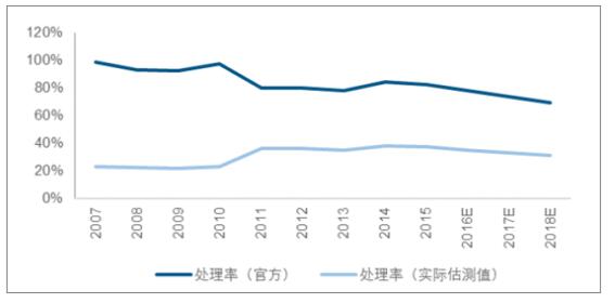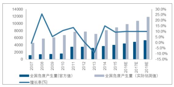 ? ? 2015年全國危廢產(chǎn)生量為3976萬噸,但是由于該數(shù)據(jù)來源于企業(yè)自主申報,明顯低于實際產(chǎn)生量。2007年危廢的產(chǎn)生量為4574萬噸,大幅高于當年《統(tǒng)計年報》所統(tǒng)計的數(shù)字1079萬噸。污染源普查公告的數(shù)字接近真實值,其與企業(yè)自主申報值得比值為4.24。由于2011年危廢申報下限由10kg下降至1kg,危廢當年的自主申報產(chǎn)生量大幅上升至3431萬噸,假設(shè)當年實際危廢增長率與前三年復合增長率相同,則當年實際估測危廢產(chǎn)量為7651萬噸,實際估測值與申報值之間比值下降為2.23,進一步假設(shè)此后該比例都相同,則預測2018年全國危廢的實際產(chǎn)量在1.18億噸。而行業(yè)內(nèi)一般認為實際危廢產(chǎn)量在一億噸左右。