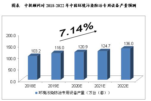 ? ? 綜合以上因素,我們預計,2018年我國環(huán)境污染防治專用設備產(chǎn)量將達到103.2萬臺(套),未來五年(2018-2022)年均復合增長率約為7.14%,2022年將達到136.0萬臺(套)。