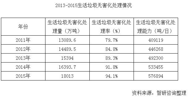 ? ? 2015年城市生活垃圾無(wú)害化處理量18013萬(wàn)噸,城市生活垃圾無(wú)害化處理率94.1%,提高2.3個(gè)百分點(diǎn)。2015年城市生活垃圾無(wú)害化處理能力576894噸/日。