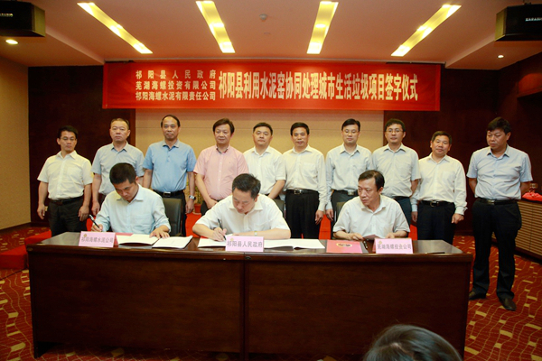? ? 周新輝、紀勤應、陳小兵分別代表祁陽縣政府、蕪湖海螺投資有限公司及祁陽海螺水泥有限責任公司在合作協(xié)議上簽字。協(xié)議約定項目由蕪湖海螺投資有限公司投資、建設和運營,在祁陽海螺廠區(qū)內(nèi)建設一套日處理能力為300噸的利用水泥窯協(xié)同處理城市生活垃圾系統(tǒng)。祁陽縣政府負責祁陽縣域內(nèi)的垃圾統(tǒng)籌收集、中轉(zhuǎn)、運輸和保量。
